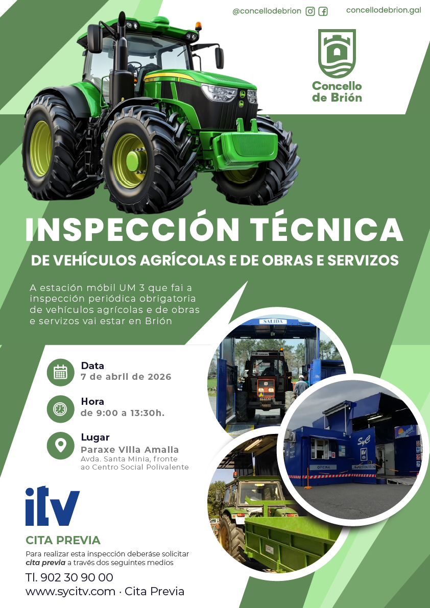 A estación móbil UM 3, encargada da inspección periódica obrigatoria de vehículos agrícolas e de obras e servizos, estará en Brión o vindeiro 7 de abril de 2026, en horario de 9:00 a 13:30 horas.